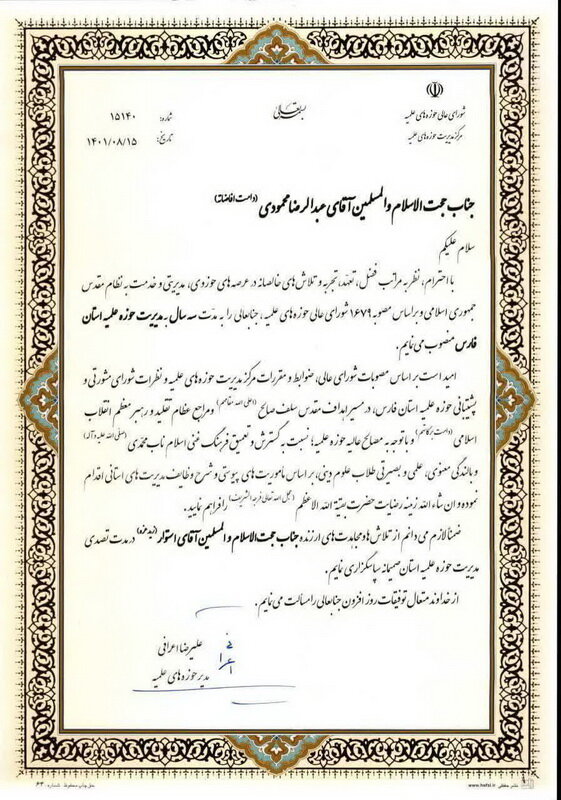 حجت الاسلام والمسلمین محمودی پیش از این مدیر حوزه علمیه خواهران استان فارس بود.
