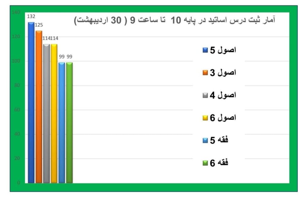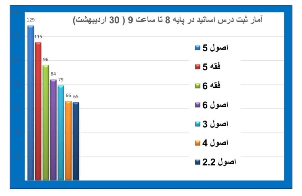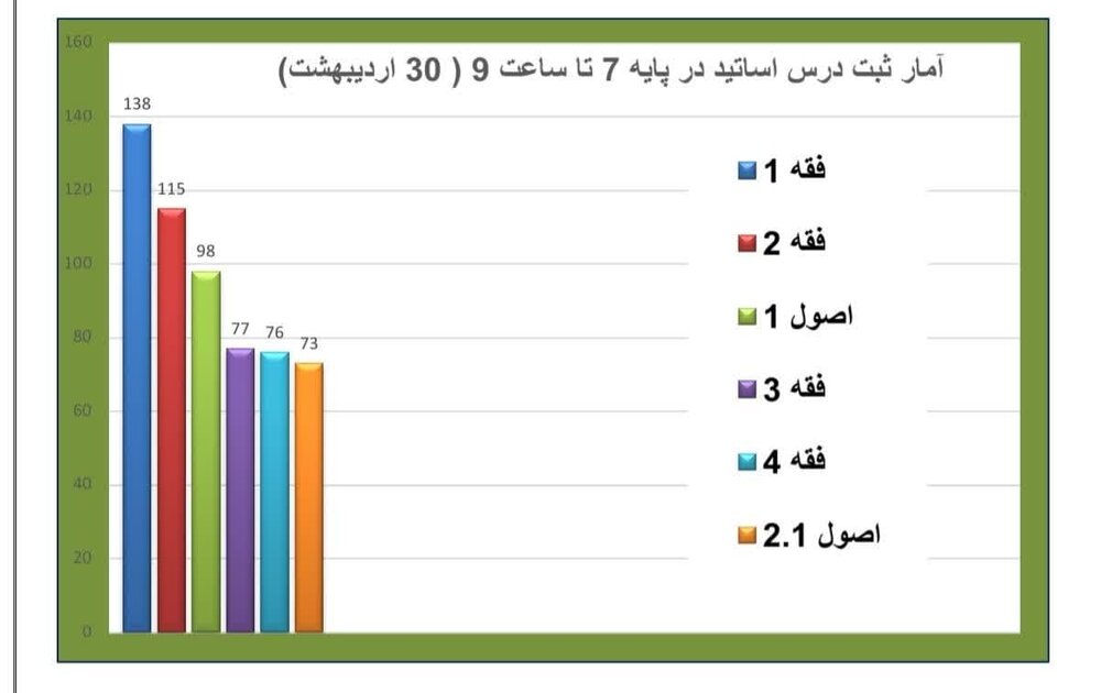 نمونه هایی از اطلاع رسانی آمار ثبت درس اساتید در دروس فقه و اصول را در ادامه مشاهده می فرمایید. در روزهای آینده آمار ثبت دروس غیر فقه و اصول نیز در کانال اطلاع رسانی می شود.