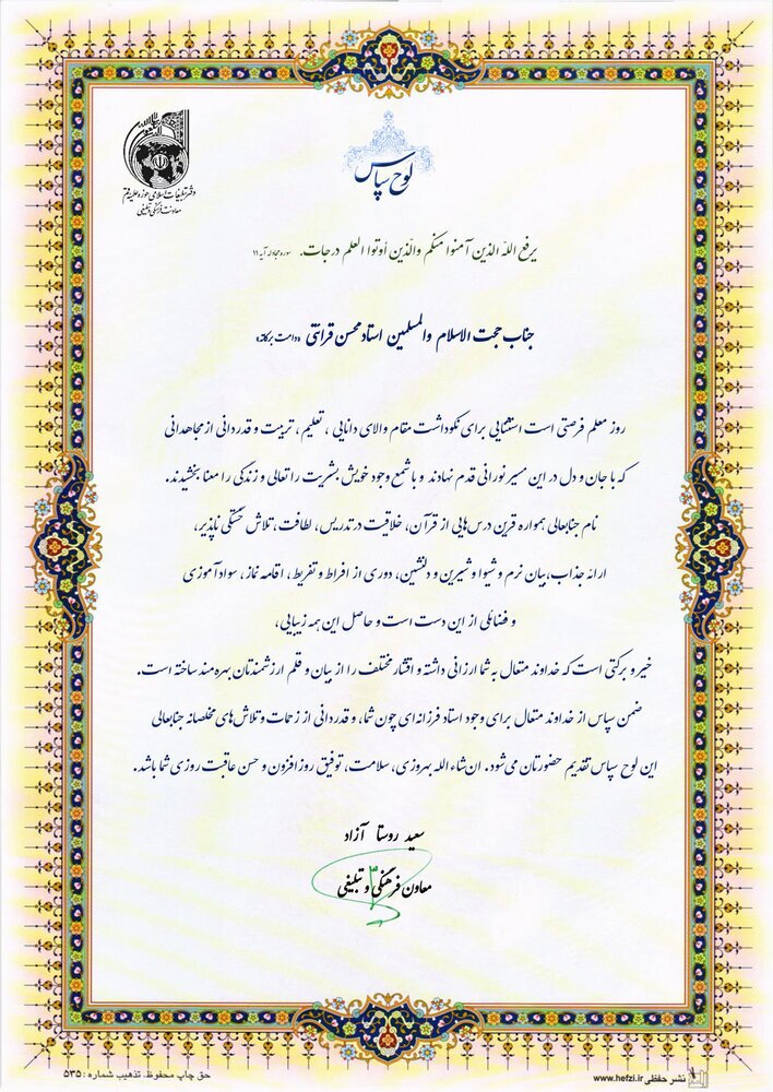 معاون فرهنگی و تبلیغی دفتر تبلیغات اسلامی این روحیه را مصداق آیه ۱۲۸ سوره توبه "لَقَدْ جَاءَکُمْ رَسُولٌ مِنْ أَنْفُسِکُمْ عَزِیزٌ عَلَیْهِ مَا عَنِتُّمْ حَرِیصٌ عَلَیْکُمْ بِالْمُؤْمِنِینَ رَءُوفٌ رَحِیمٌ"دانست و تأکید کرد: این اشتیاق و تعهد برای هدایت مردم، کاملاً در فعالیتهای استاد قرائتی مشهود است.