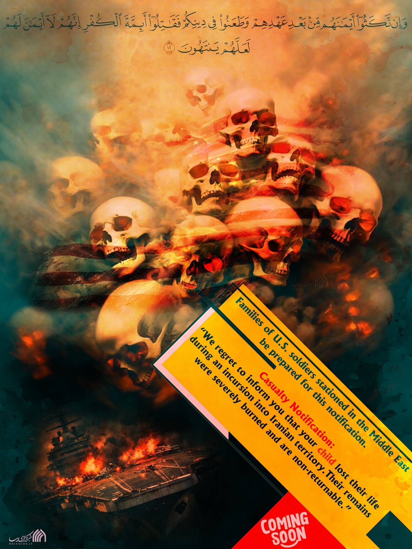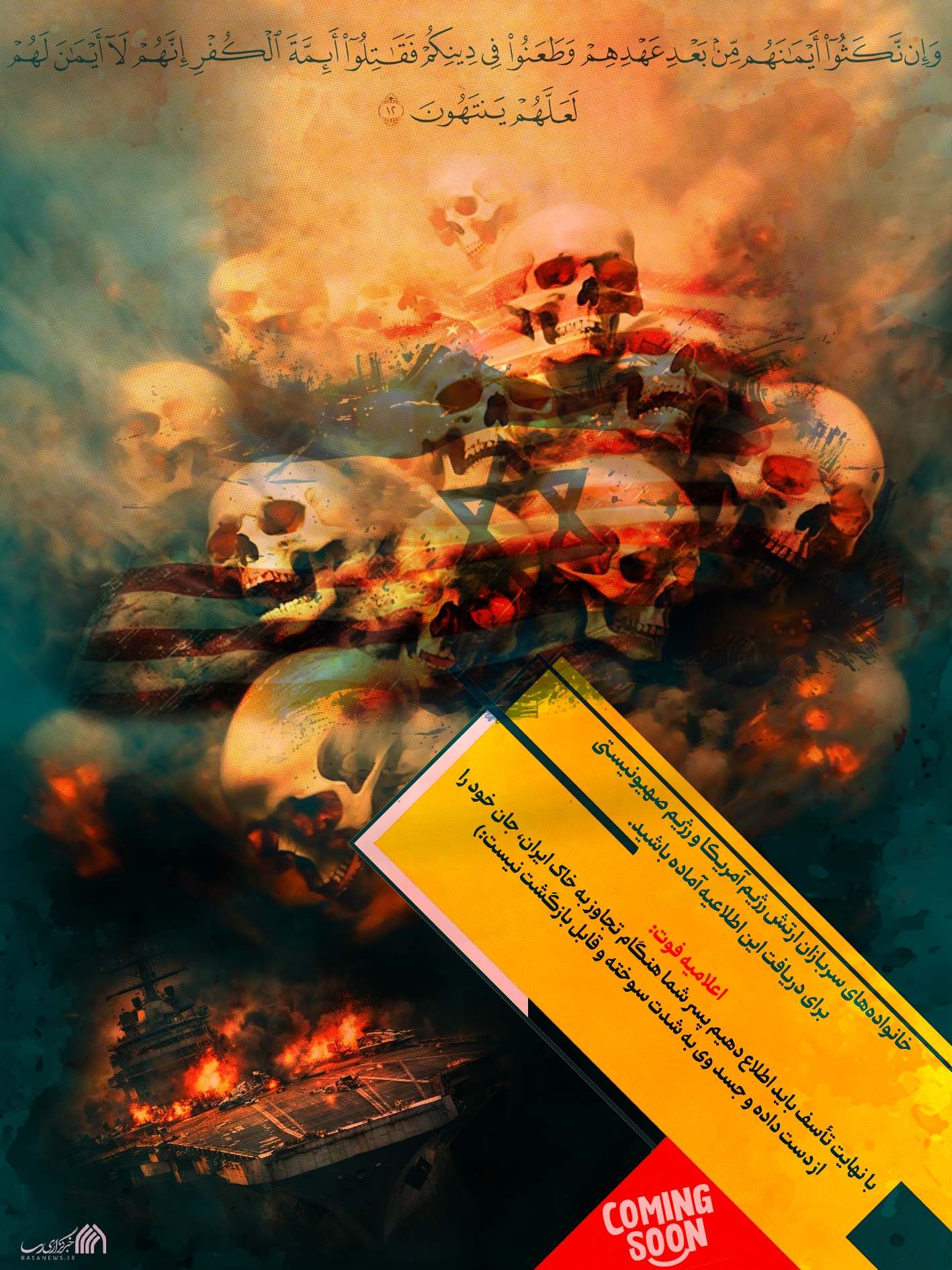 این یک هشدار جدیست. در صورت تجاوز به خاک پاک ایران؛ خانوادههای سربازان ارتش رژیم آمریکا و رژیم صهیونیستی، برای دریافت خبر هلاکت عزیزانتان آماده باشید.(پوسترها به سه زبان فارسی، انگلیسی و عبری تولید شده است)